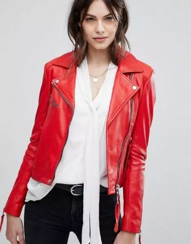 Pair this red leather jacket with black skinny jeans and ankle boots for a chic, edgy look. For a more casual style, wear it over a white tee and denim jeans. This versatile jacket can easily transition from day to night, making it a great addition to any wardrobe.